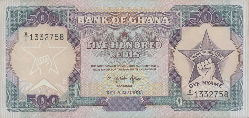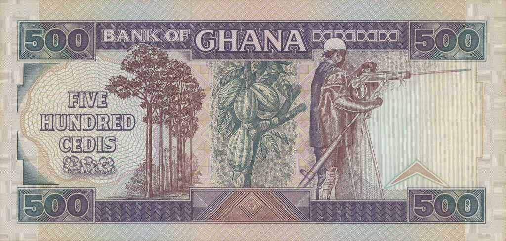 | Ghana | 500 Cedi | ID: 31/12/1986-10/06/1994 TNID: 10/08/1993 |