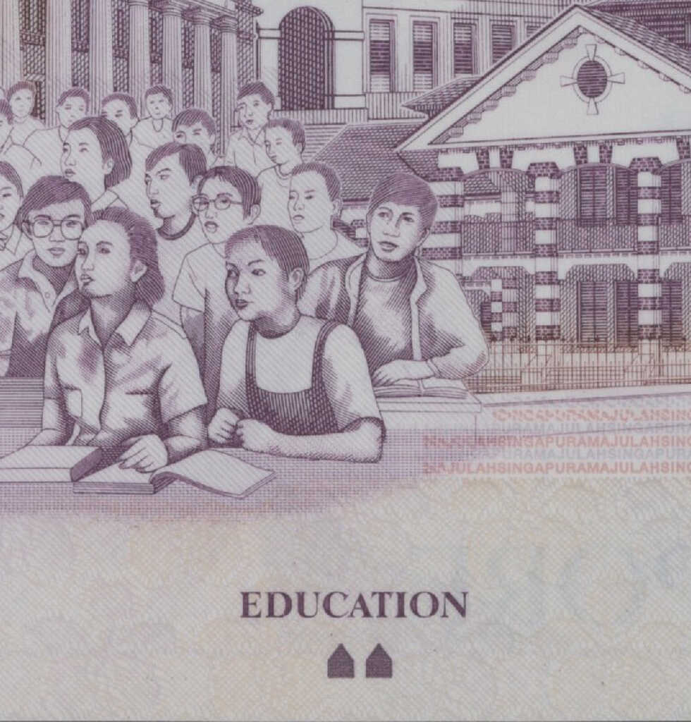 Portrait of the first president of Singapore, Yusof bin Ishak at right. Singapore coat of arms in the transparent window at the top left corner |