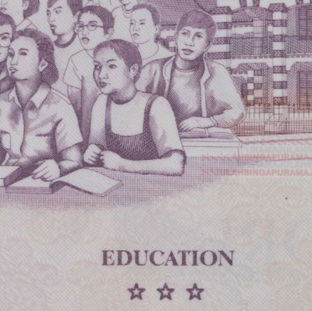 Portrait of the first president of Singapore, Yusof bin Ishak at right. Singapore coat of arms in the transparent window at the top left corner |