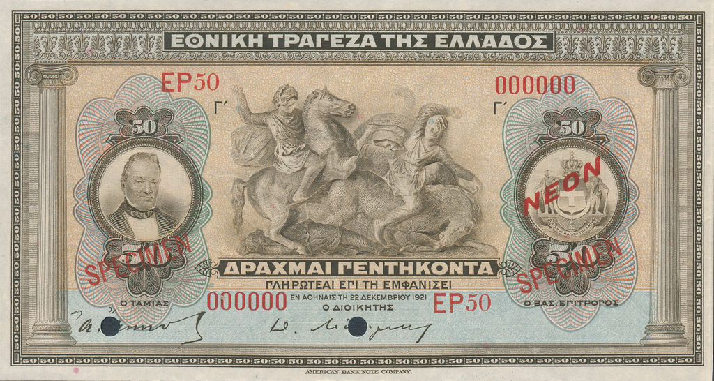 | Greece | 50 Drachma | ID: 06/10/1922 | P-0066s 62b |